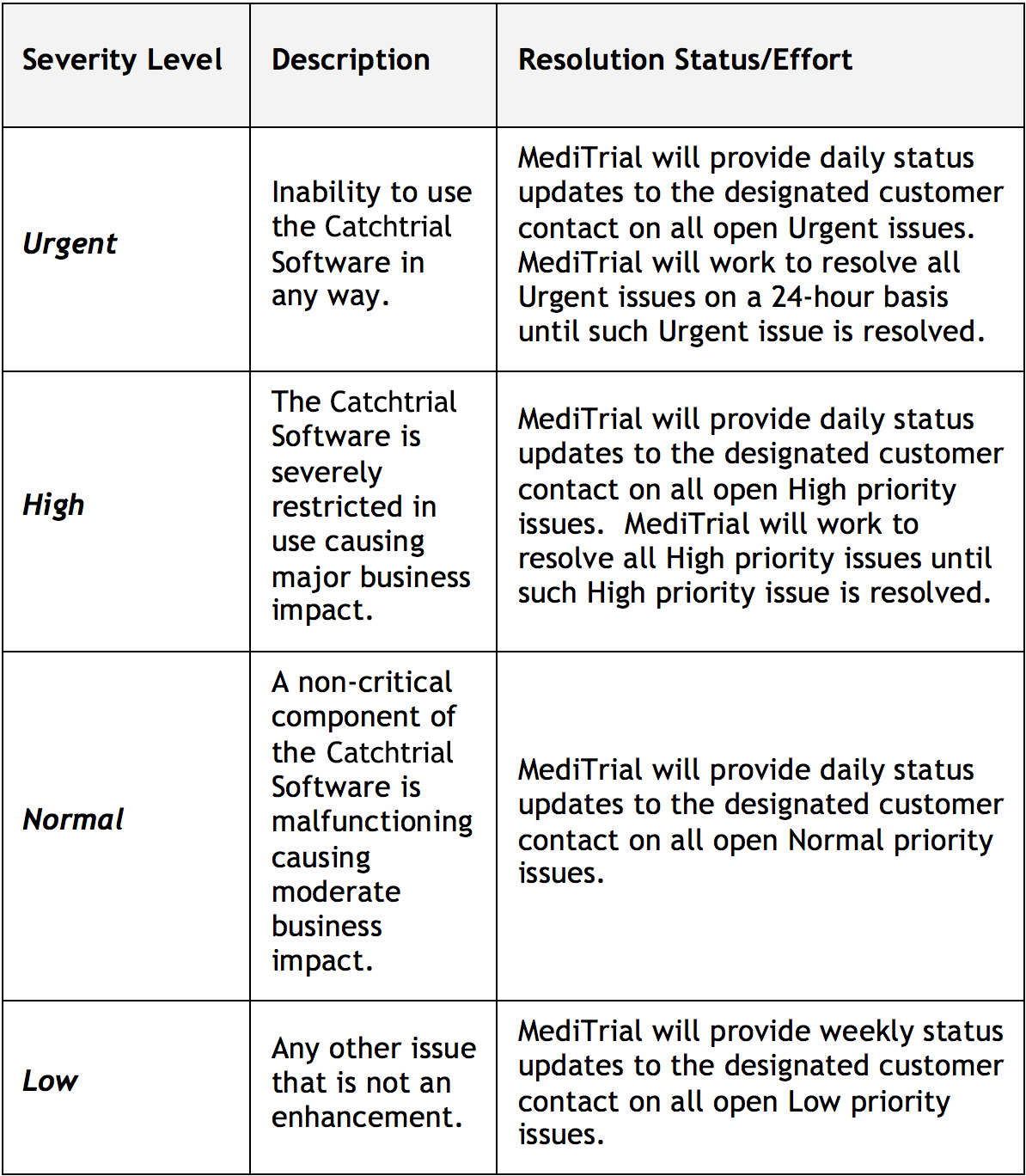 • As part of Support Services, MediTrial will investigate all reproducible, material failures of the Catchtrial Software to conform to the functional specifications as described in the applicable Documentation. MediTrial will classify the severity of the error, provide efforts to correct the error or provide a workaround to the error as defined in the table below.